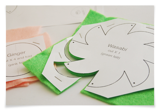 אחרי שגזרתם את צורת "הפרח" של הוואסבי, תופרים את הקצוות של כל אחד מעלי הכותרת (מעבירים את המחט במיקום של הנקודות השחורות המסומנות בגזרה). חשוב להעביר את המחט באותו הכיוון בין כל העלים!